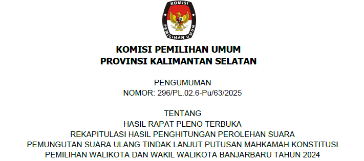 Dalam rangka melaksanakan ketentuan Pasal 52 Peraturan Komisi Pemilihan Umum Nomor 18 Tahun 2024 tentang Rekapitulasi Hasil Penghitungan Perolehan Suara dan Penetapan Hasil Pemilihan Gubernur dan Wakil Gubernur, Bupati dan Wakil Bupati, serta Wali Kota dan Wakil Wali Kota, Komisi Pemilihan Umum Provinsi Kalimantan Selatan dengan ini mengumumkan Hasil Rapat Pleno Terbuka Rekapitulasi Hasil Penghitungan Perolehan Suara Pemungutan Suara Ulang Tindak Lanjut Putusan Mahkamah Konstitusi Pemilihan Wali Kota dan Wakil Wali Kota Banjarbaru Tahun 2024. Keputusan ini dituangkan dalam Keputusan Komisi Pemilihan Umum Provinsi Kalimantan Selatan Nomor 69 Tahun 2025 tentang Penetapan Hasil Pemungutan Suara Ulang Tindak Lanjut Putusan Mahmakah Konstitusi Pemilihan Wali Kota dan Wakil Wali Kota Banjarbaru Tahun 2024. Untuk informasi lebih lanjut mengenai pengumuman tersebut, silakan akses tautan berikut: [ KLIK DI SINI ] ....
