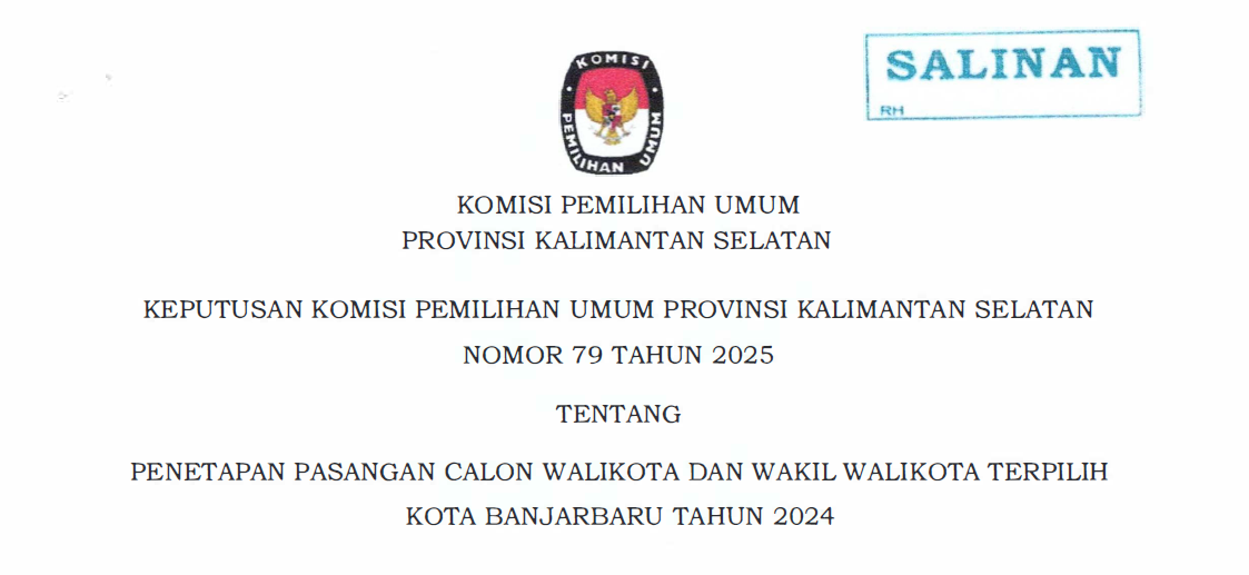 Dalam rangka melaksanakan ketentuan Pasal 55 Peraturan Komisi Pemilihan Umum Nomor 18 Tahun 2024 tentang Rekapitulasi Hasil Penghitungan Perolehan Suara dan Penetapan Hasil Pemilihan Gubernur dan Wakil Gubernur, Bupati dan Wakil Bupati, serta Wali Kota dan Wakil Wali Kota, Komisi Pemilihan Umum Provinsi Kalimantan Selatan menetapkan Pasangan Calon Wali Kota dan Wakil Wali Kota Terpilih dalam Pemilihan Wali Kota dan Wakil Wali Kota Banjarbaru Tahun 2024. Penetapan ini dilakukan setelah berakhirnya seluruh proses hukum terkait hasil Pemungutan Suara Ulang (PSU) Pemilihan Wali Kota dan Wakil Wali Kota Banjarbaru, sebagaimana telah diputus oleh Mahkamah Konstitusi melalui Putusan Nomor 318/PHPU.WAKO-XXIII/2025 dan Nomor 319/PHPU.WAKO-XXIII/2025 tanggal 26 Mei 2025, yang pada pokoknya menyatakan permohonan pemohon tidak dapat diterima dan menolak seluruh dalil permohonan. Setelah itu, Komisi Pemilihan Umum Provinsi Kalimantan Selatan menyelenggarakan Rapat Pleno Terbuka Penetapan Pasangan Calon Terpilih sebagaimana dituangkan dalam Berita Acara Nomor 100/PL.02.7-BA/63/2025 tanggal 28 Mei 2025. Keputusan penetapan ini dituangkan dalam Keputusan Komisi Pemilihan Umum Provinsi Kalimantan Selatan Nomor 79 Tahun 2025 tentang Penetapan Pasangan Calon Wali Kota dan Wakil Wali Kota Terpilih Kota Banjarbaru Tahun 2024. Untuk informasi lebih lanjut dan salinan keputusan, silakan akses tautan berikut: [ KLIK DI SINI ] ....