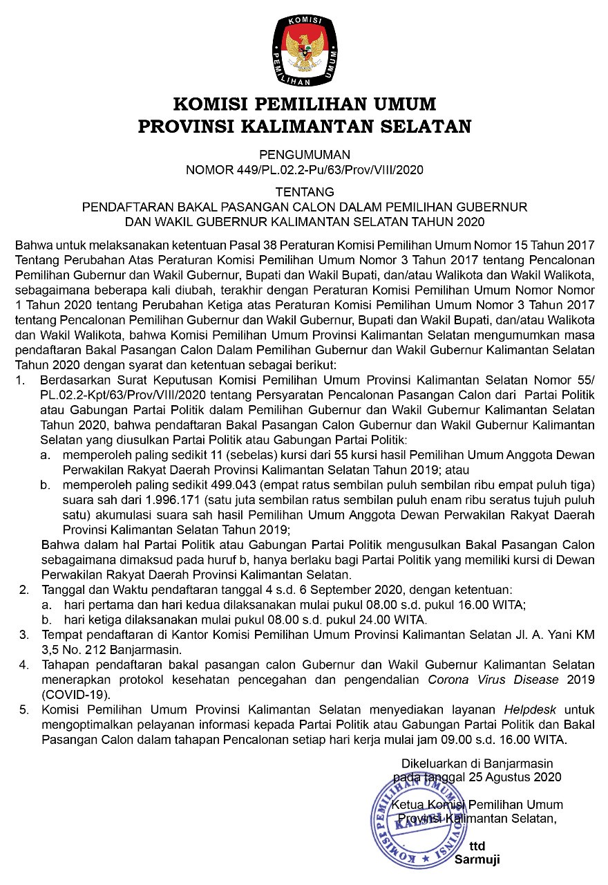 Pengumuman Bakal Pasangan Calon Dalam Pemilihan Gubernur dan Wakil Gubernur Kalimantan Selatan Tahun 2020