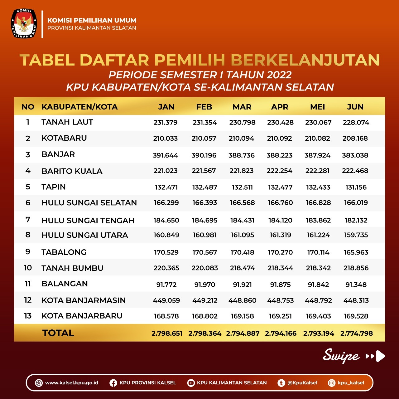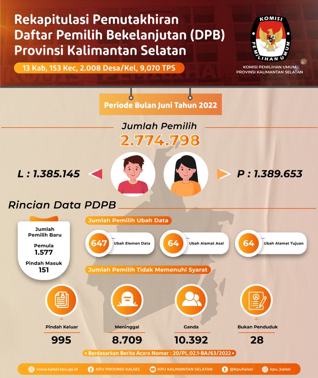 Rekapitulasi Daftar Pemilih Berkelanjutan periode bulan Juni Tahun 2022 dengan jumlah sebanyak 2.774.798 (Dua Juta Tujuh Ratus Tujuh Puluh Empat Ribu Tujuh Ratus Sembilan Puluh Delapan) pemilih dengan rincian pemilih laki-laki berjumlah 1.385.145 (Satu Juta Tiga Ratus Delapan Puluh Lima Ribu Seratus Empat Puluh Lima) pemilih dan pemilih perempuan bejumlah 1.389.653 (Satu Juta Tiga Ratus Delapan Puluh Sembilan Ribu Enam Ratus Lima Puluh Tiga) pemilih, tersebar di 13 (Tiga Belas) Kabupaten/Kota. Selengkapnya dapat dilihat pada softcopy Berita Acara berikut: [KLIK DISINI]