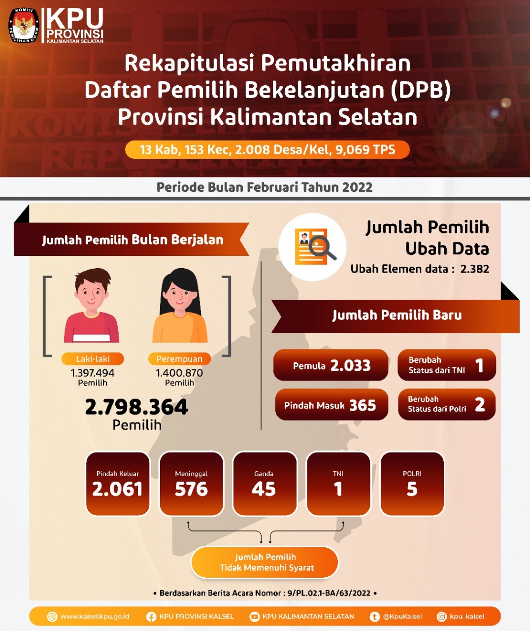 Banjarmasin, kalsel@kpu.go.id - Berdasarkan ketentuan Peraturan Komisi Pemilihan Umum Nomor 6 Tahun 2021 tentang Pemutakhiran Data Pemilih Berkelanjutan, maka KPU Provinsi Kalimantan Selatan melaksanakan Rapat Koordinasi Daftar Pemilih Berkelanjutan Periode Bulan Februari Tahun 2022 pada Rabu (9/3), dengan hasil sebagai berikut: [KLIK DISINI]