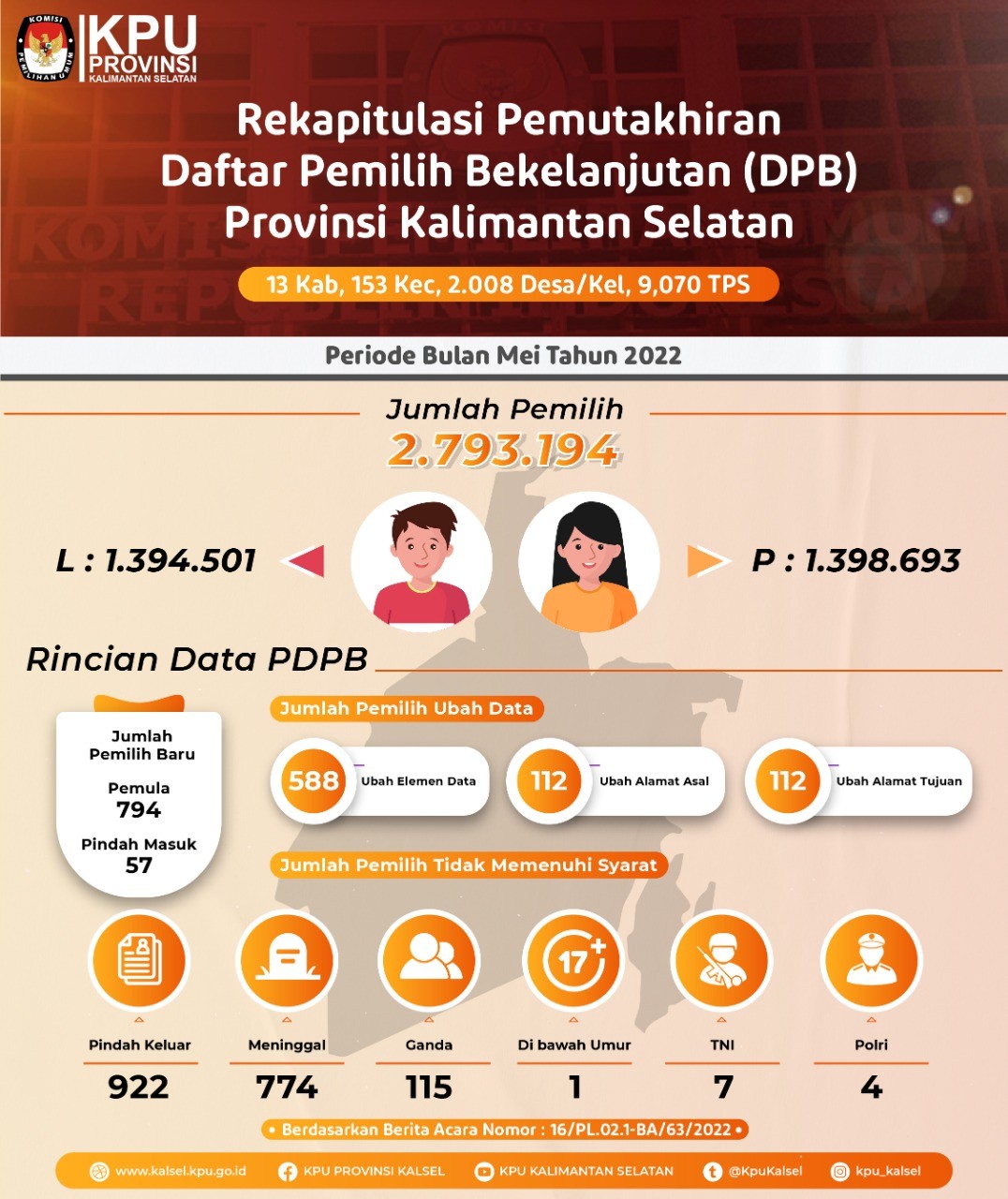 Berdasarkan ketentuan Peraturan Komisi Pemilihan Umum Nomor 6 Tahun 2021 tentang Pemutakhiran Data Pemilih Berkelanjutan, maka KPU Provinsi Kalimantan Selatan melaksanakan Rapat Koordinasi Daftar Pemilih Berkelanjutan Periode Bulan Mei Tahun 2022 dengan hasil sebagai berikut: