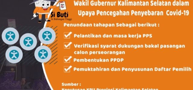 Sesuai dengan perkembangan status wilayah. Terjadi peningkatan penyebaran Covid-19 di Wilayah Negara Kesatuan Republik Indonesia. Menimbang pernyataan resmi World Health Organization (WHO) bahwa Covid-19 menyebabkan public health emergency of international, pernyataan Presiden Republik Indonesia, Joko Widodo yang intinya bahwa penyebaran Covid-19 di Indonesia sebagai bencana nasional (non-alam), serta keputusan Kepala BNPB Nomor 13.A Tahun 2020 tentang status Keadaan Tertentu Darurat Bencana Wabah Penyakit Akibat Virus Corona di Indonesia tertanggal 29 Februari 2020, yang pada intinya menetapkan perpanjangan status keadaan darurat bencana wabah penyakit akibat Covid-19 di Indonesia selama 91 hari sejak 29 Februari 2020 sampai dengan 29 Mei 2020. Potensi penyebaran Covid-19 dapat mengenai semua orang, setiap waktu dan tempat yang tidak dapat ditentukan berpotensial menjadi gangguan dalam penyelenggaraan Pemilihan Tahun 2020. KPU Republik Indonesia telah mengeluarkan Keputusan Nomor: 179/PL.02-Kpt/01/KPU/III/2020 dan Surat Edaran Nomor Surat Edaran Nomor 8 Tahun 2020 tentang Pelaksanaan Keputusan KPU Nomor 179/PL.02-Kpt/01/KPU/III/2020 tentang Penundaan Tahapan Pemilihan Gubernur dan Wakil Gubernur, Bupati dan Wakil Bupati, dan/atau Wali Kota dan Wakil Wali Kota Tahun 2020 dalam Upaya Pencegahan Penyebaran Covid-19. Menidaklanjuti keputusan dan surat edaran KPU tersebut, KPU Provinsi Kalimantan Selatan telah menetapkan penundaan tahapan melalui Keputusan Nomor: 30/PL.02-Kpt/63/PROV/III/2020 dan mengeluarkan Surat Dinas Nomor: 196/PL.02-SD/63/PROV/III/2020 yang disampaikan kepada KPU Kabupaten/Kota, ditembuskan kepada KPU Republik Indonesia, Pemerintah Daerah Provinsi Kalimantan Selatan, dan Bawaslu Provinsi Kalimantan Selatan. Berikut tahapan-tahapan yang ditunda: _Pertama_, Pelantikan PPS tanggal 22 Maret 2020 dan Masa Kerja Panitia Pemungutan Suara: 23 Maret s.d. 23 November 2020 dengan ketentuan dalam hal PPS sudah dilantik masa kerjanya ditunda; dan dalam hal PPS akan dilantik, dalam pelaksanaannya harus berkoordinasi pihak terkait (Pemerintah Daerah dan Kepolisian setempat). _Kedua_, Verifikasi Syarat Dukungan Calon Perseorangan, yang terdiri dari: penyampaian dukungan Bakal Pasangan Calon Gubernur dan Wakil Gubernur, Bupati dan Wakil Bupati/Wali Kota dan Wakil Wali Kota dari KPU Kabupaten/Kota kepada PPS: 26 Maret 2020 s.d. 2 April 2020; Verifikasi faktual di tingkat desa/kelurahan, selama 14 (empat belas) hari sejak dokumen syarat dukungan Bakal Pasangan Calon diterima oleh PPS: 26 Maret 2020 s.d. 15 April 2020; Rekapitulasi Dukungan di tingkat kecamatan: 16 April 2020 s.d. 22 April 2020; Rekapitulasi Dukungan di tingkat kabupaten/kota: 23 April 2020 s.d. 24 April 2020; Rekapitulasi Dukungan di tingkat provinsi: 25 April 2020 s.d. 26 April 2020; Pemberitahuan Hasil Rekapitulasi Dukungan Bakal Pasangan Calon Gubernur dan Wakil Gubernur/Bupati dan Wakil Bupati/Walikota dan Wakil Walikota: 27 April 2020 s.d. 28 April 2020; Penyerahan syarat dukungan perbaikan kepada KPU Provinsi atau KPU Kabupaten/Kota: 29 April 2020 s.d. 1 Mei 2020; Pengecekan jumlah dukungan dan sebaran hasil perbaikan: 29 April 2020 s.d. 2 Mei 2020; Verifikasi administrasi dan Kegandaaan Dokumen Dukungan Perbaikan: 1 Mei 2020 s.d. 9 Mei 2020; Penyampaian syarat dukungan hasil perbaikan dari KPU Provinsi kepada KPU Kabupaten/Kota: 10 Mei 2020 s.d. 12 Mei 2020; Penyampaian syarat dukungan hasil perbaikan Pasangan Calon Gubernur dan Wakil Gubernur, Bupati dan Wakil Bupati/Wali Kota dan Wakil Wali Kota kepada PPS: 13 Mei 2020 s.d. 15 Mei 2020; Verifikasi faktual perbaikan di tingkat desa/kelurahan: 13 Mei 2020 s.d. 21 Mei 2020; Rekapitulasi Dukungan hasil perbaikan di tingkat kecamatan: 22 Mei 2020 s.d. 24 Mei 2020; Rekapitulasi Dukungan hasil perbaikan di tingkat kabupaten/kota: 24 Mei 2020 s.d. 26 Mei 2020; dan Rekapitulasi Dukungan hasil perbaikan di tingkat provinsi: 27 Mei 2020 s.d. 28 Mei 2020. _Ketiga_, Pembentukan PPDP: 26 Maret 2020 s.d. 15 April 2020, dengan Masa Kerja PPDP: 16 April 2020 s.d. 17 Mei 2020. _Keempat_, Pemuktahiran dan penyusunan daftar pemilih yang terdiri dari Penyusunan daftar pemilih oleh KPU Kabupaten/Kota dan penyampaian kepada PPS tanggal 23 Maret 2020 s.d 17 April 2020; dan Pencocokan dan Penelitian tanggal 18 April 2020 s.d 17 Mei 2020. Penyelenggaraan empat tahapan tersebut melibatkan dan mengumpulkan banyak orang. Berpotensial terjadinya penyebaran Covid-19 jika tetap diselenggarakan di masa-masa sekarang. Apalagi di Kalimantan Selatan yang wilayahnya sudah naik status menjadi tanggap darurat. Protokol kesehatan dalam mencegah Covid-19 harus ditaati. Pemilihan merupakan bagian kepentingan dan hajat umum. Namun, kesehatan dan keselamatan warga negara, penyelenggara pemilihan, dan semua pihak sama pentingnya. Penundaan penyelenggaraan empat tahapan tersebut juga dalam rangka upaya partisipatif pencegahan Covid-19. Kita bertindak cepat mengambil langkah-langkah mitigasi. Ikut mencegah penyebaran wabah ini. Proteksi jajaran penyelenggara dan semua pihak, serta bersama melawan penyebaran covid-19.