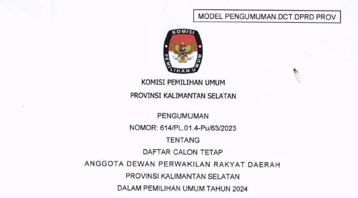 PENGUMUMAN DCT ANGGOTA DPRD PROVINSI KALIMANTAN SELATAN DALAM PEMILU TAHUN 2024