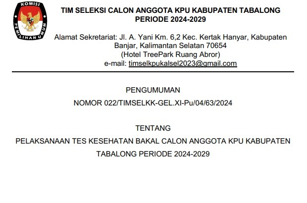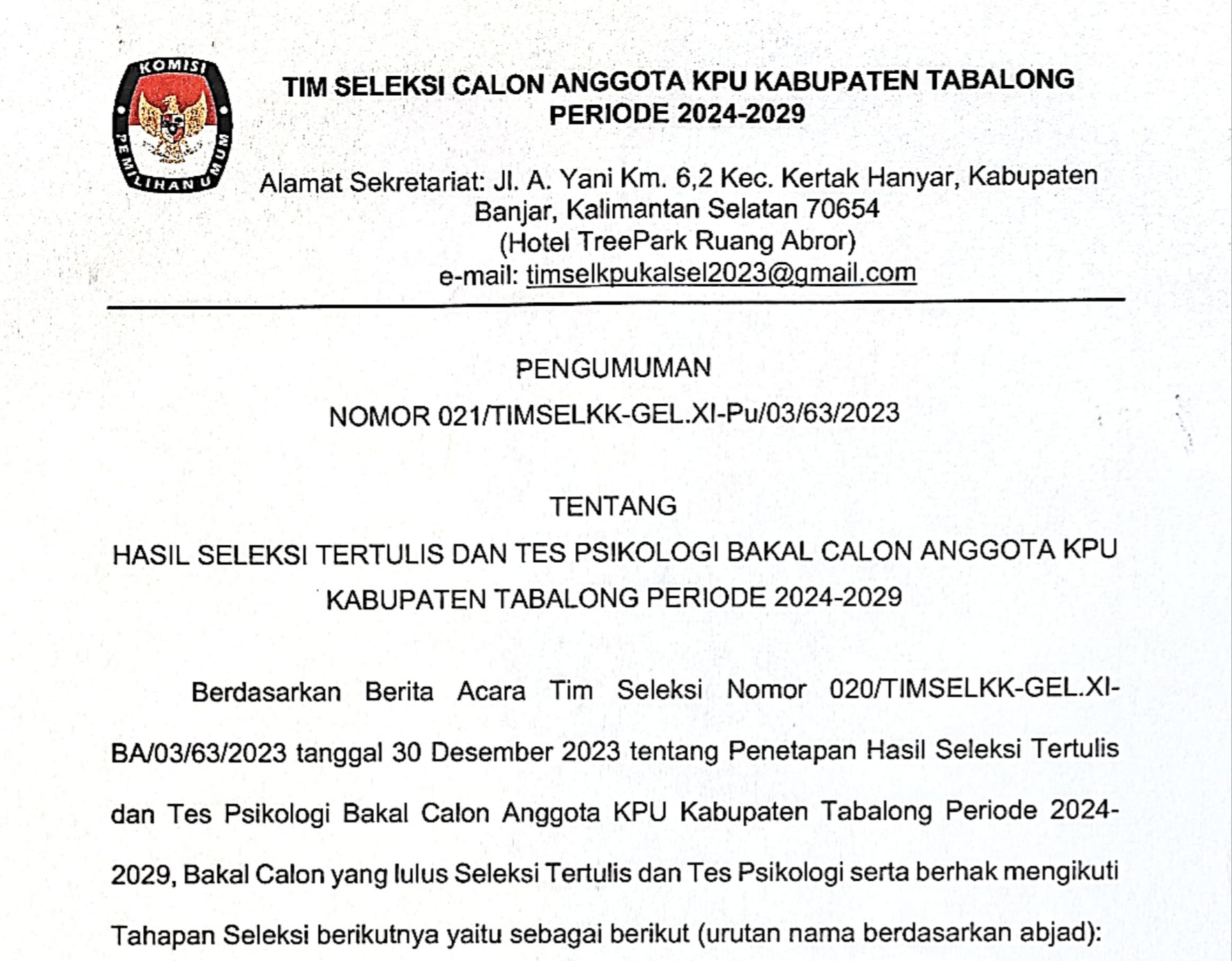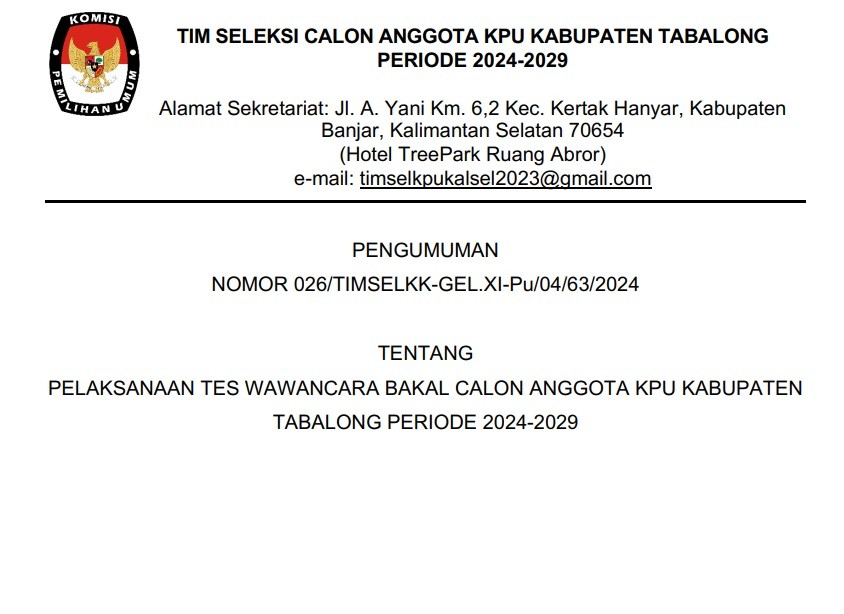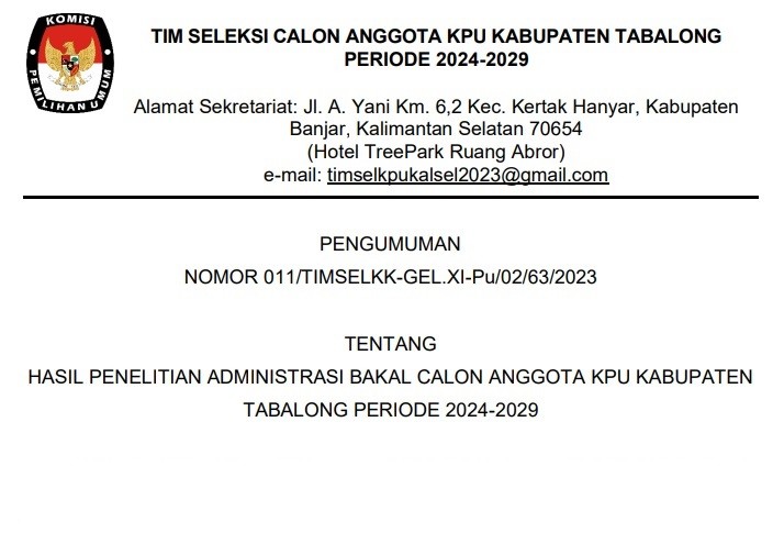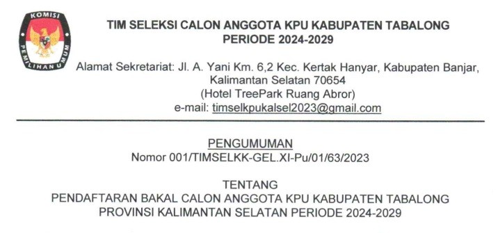 Berdasarkan ketentuan Pasal 85 Peraturan KPU Nomor 10 Tahun 2023 tentang Pencalonan Anggota Dewan Perwakilan Rakyat, Dewan Perwakilan Rakyat Daerah Provinsi, dan Dewan Perwakilan Rakyat Daerah Kabupaten/Kota, dan berdasarkan Keputusan Komisi Pemilihan Umum Provinsi Kalimantan Selatan Nomor 33 Tahun 2023 tentang Daftar Calon Tetap Anggota Dewan Perwakilan Daerah Provinsi Kalimantan Selatan, Komisi Pemilihan Umum Provinsi Kalimantan Selatan mengumumkan Daftar Calon Tetap (DCT) Anggota Dewan Perwakilan Daerah Provinsi Kalimantan Selatan dan persentase keterwakilan perempuan dalam Daftar Calon Tetap (DCT). Dokumen yang dimaksud dapat diakses melalui tautan berikut: