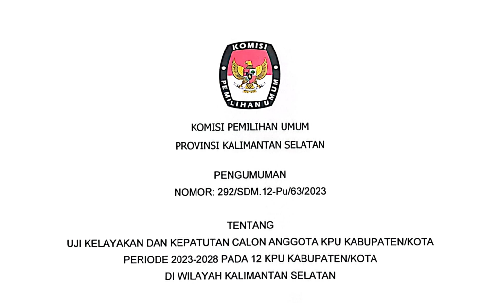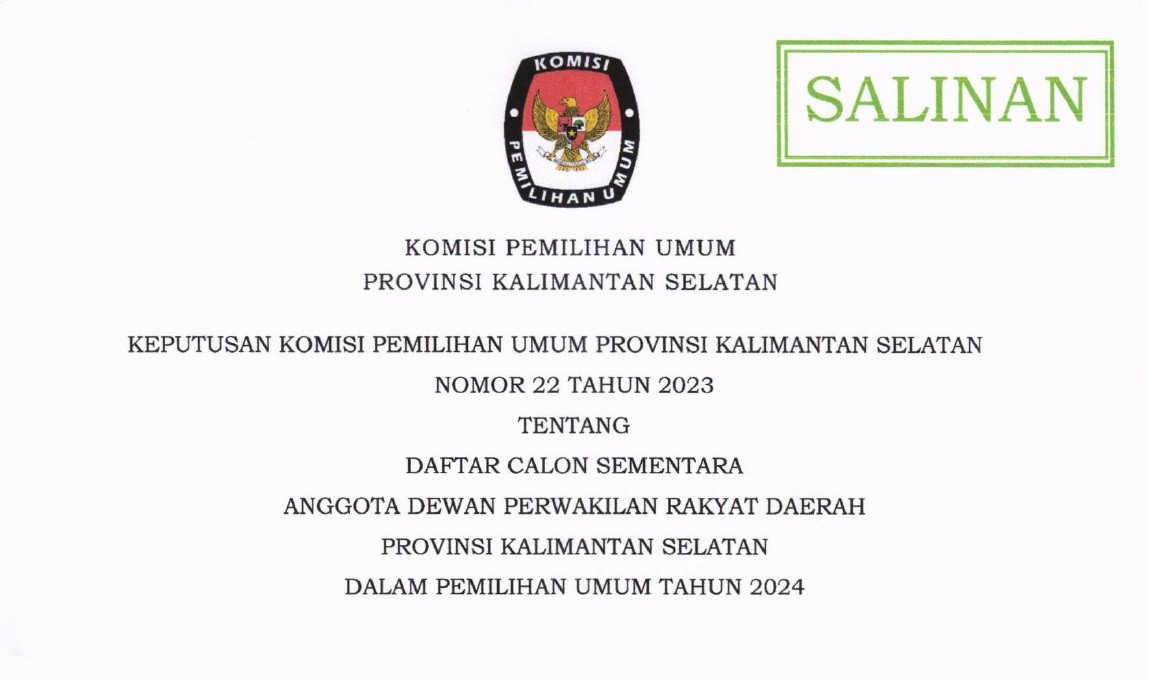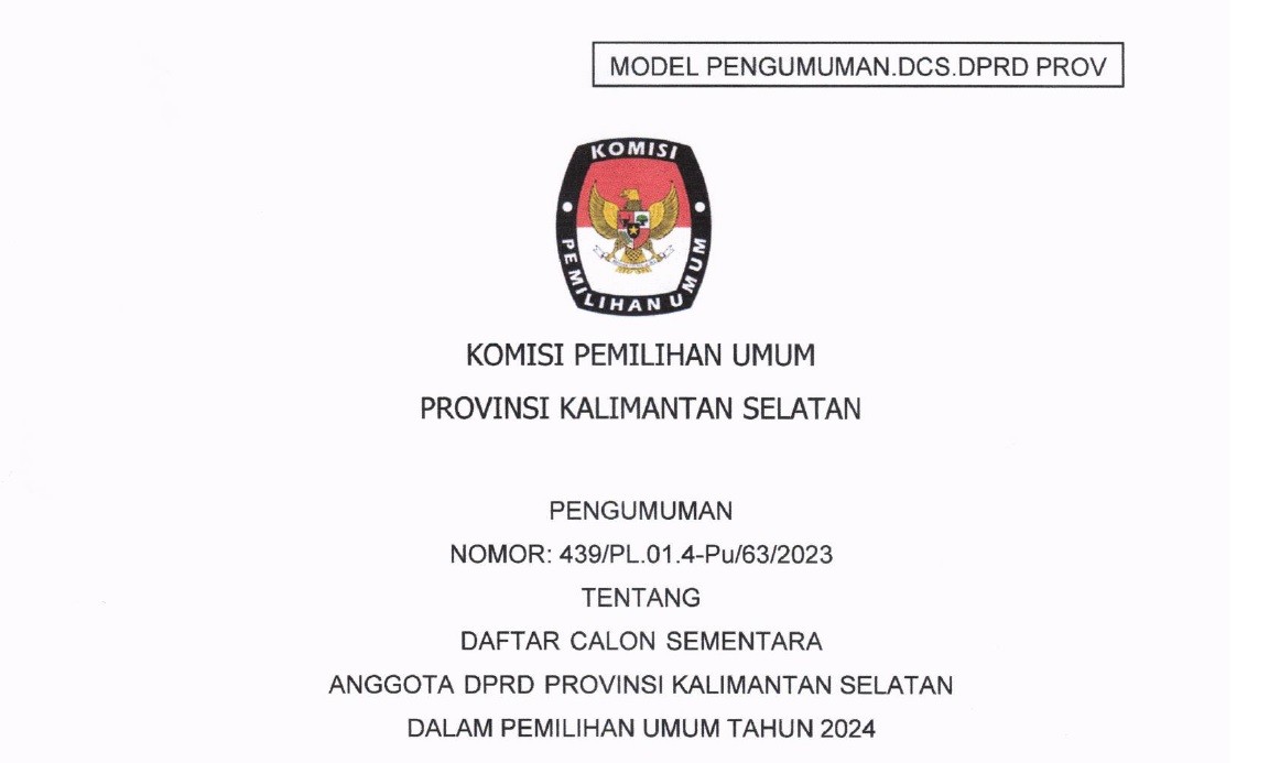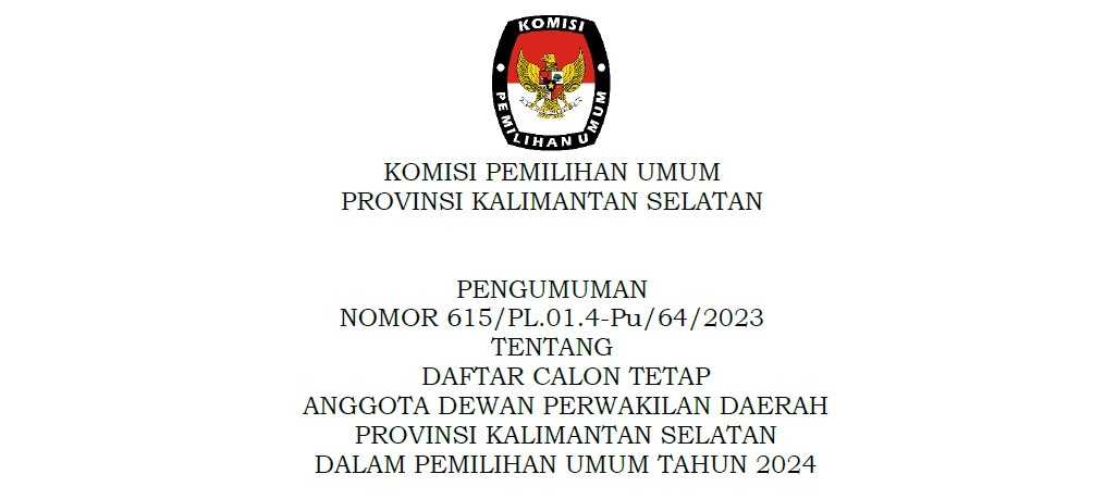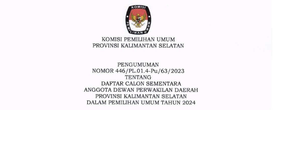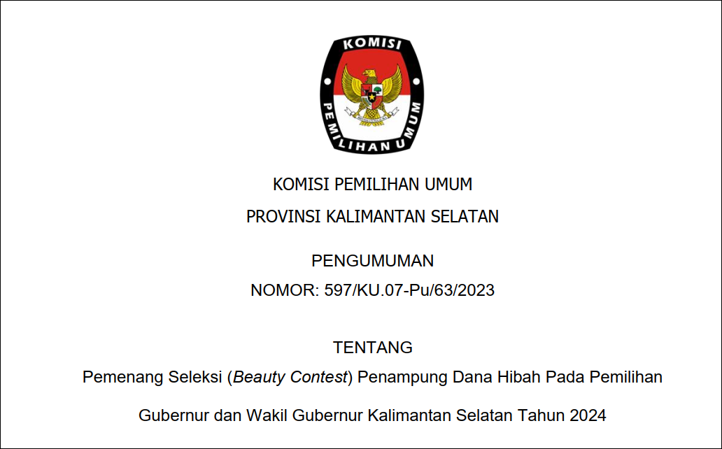 Sehubungan dengan telah dilaksanakannya pelaksanaan Seleksi (Beauty Contest) Penampung Dana Hibah Pada Pemilihan Gubernur dan Wakil Gubernur Kalimantan Selatan Tahun 2024 pada hari Selasa s.d. Rabu tanggal 24 s.d. 25 Oktober 2023, Tim Seleksi (Beauty Contest) Penampung Dana Hibah Pada Pemilihan Gubernur dan Wakil Gubernur Kalimantan Selatan Tahun 2024 telah menetapkan pemenang Seleksi (Beauty Contest) Penampung Dana Hibah Pada Pemilihan Gubernur dan Wakil Gubernur Kalimantan Selatan Tahun 2024 dan ditetapkan berdasarkan Keputusan Komisi Pemilihan Umum Provinsi Kalimantan Selatan Nomor 29 Tahun 2023 tentang Pemenang Seleksi Penampung Dana Hibah Pada Pemilihan Gubernur dan Wakil Gubernur Kalimantan Selatan Tahun 2024, berkenaan hal tersebut maka diumumkan sebagai berikut: Bahwa Pemenang Seleksi (Beauty Contest) Penampung Dana Hibah Pada Pemilihan Gubernur dan Wakil Gubernur Kalimantan Selatan Tahun 2024 adalah PT. BANK TABUNGAN NEGARA (Persero) TBK Kantor Cabang Banjarmasin. Bahwa Keputusan Tim Seleksi (Beauty Contest) Penampung Dana Hibah Pada Pemilihan Gubernur dan Wakil Gubernur Kalimantan Selatan Tahun 2024 bersifat mutlak dan tidak dapat diganggu gugat. Demikian pengumuman ini disampaikan, atas perhatiannya diucapkan terimakasih. BERKAS SOFTFILE PENGUMUMAN DAPAT DI UNDUH PADA >>KLICK DISINI<<