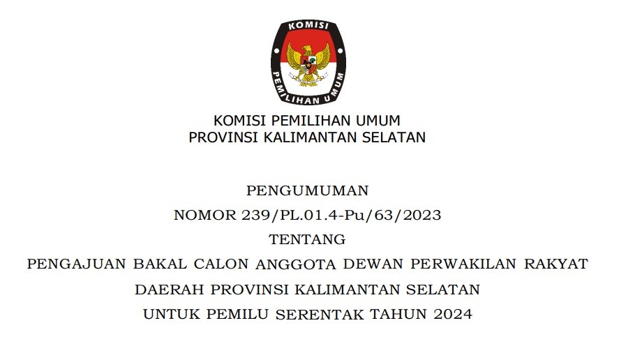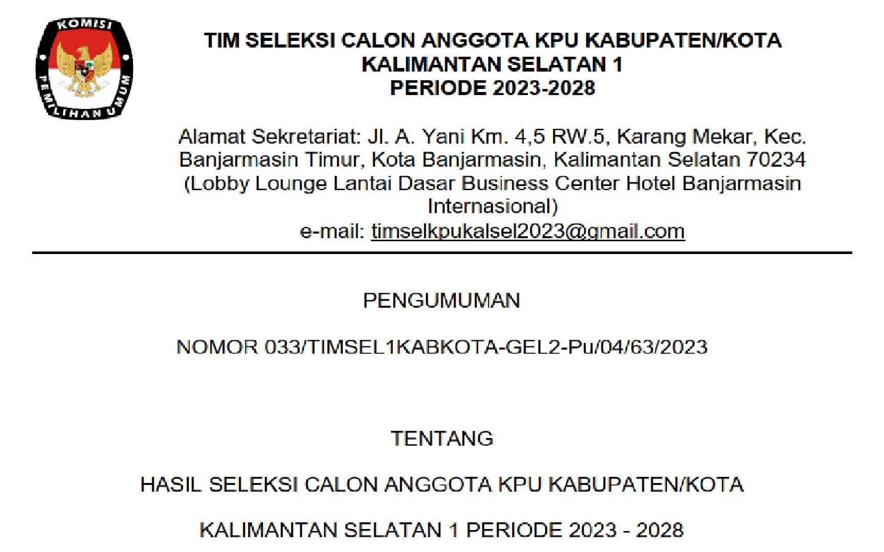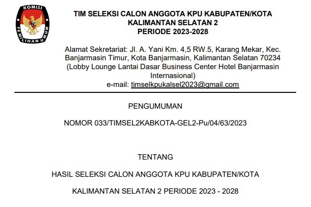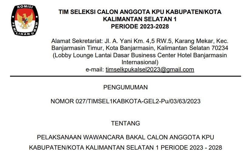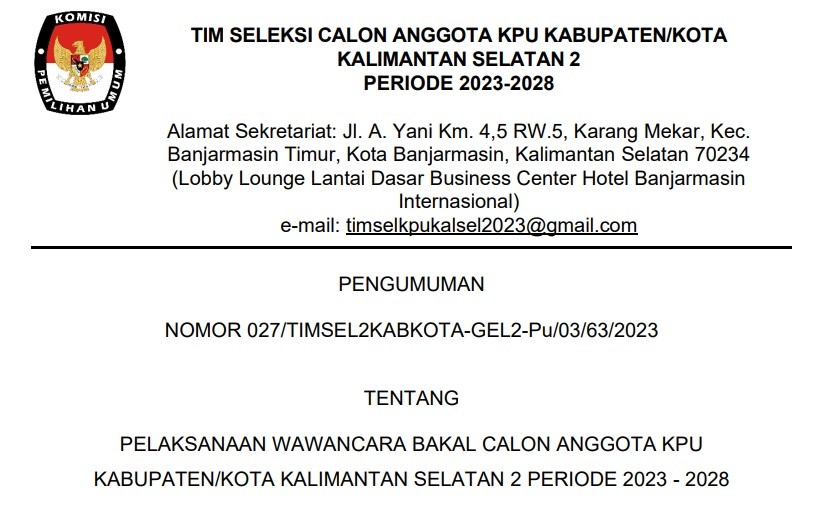 Sehubungan dengan Pengumuman Nomor 024/TIMSEL2KABKOTA-GEL2-Pu/03/63/2023 tentang Hasil Seleksi Tertulis dan Tes Psikologi Bakal Calon Anggota KPU Kabupaten/Kota Kalimantan Selatan 2 Periode 2023 – 2028 dan Keputusan Komisi Pemilihan Umum Republik Indonesia Nomor 126 Tahun 2023 tentang Perubahan Kedua Atas Keputusan Komisi Pemilihan Umum Nomor 126 Tahun 2023 tentang Jadwal Tahapan Pelaksanaan Seleksi Calon Anggota Komisi Pemilihan Umum Kabupaten/kota untuk 118 (Seratus Delapan Belas) Kabupaten/Kota pada 15 (Lima Belas) Provinsi Periode 2023-2028, terdapat perubahan jadwal pelaksanaan wawancara Bakal Calon Anggota KPU Kabupaten/Kota Kalimantan Selatan 2 Periode 2023 – 2028, adapun informasi pelaksanaan wawancara disampaikan sebagai berikut: [KLIK DISINI]