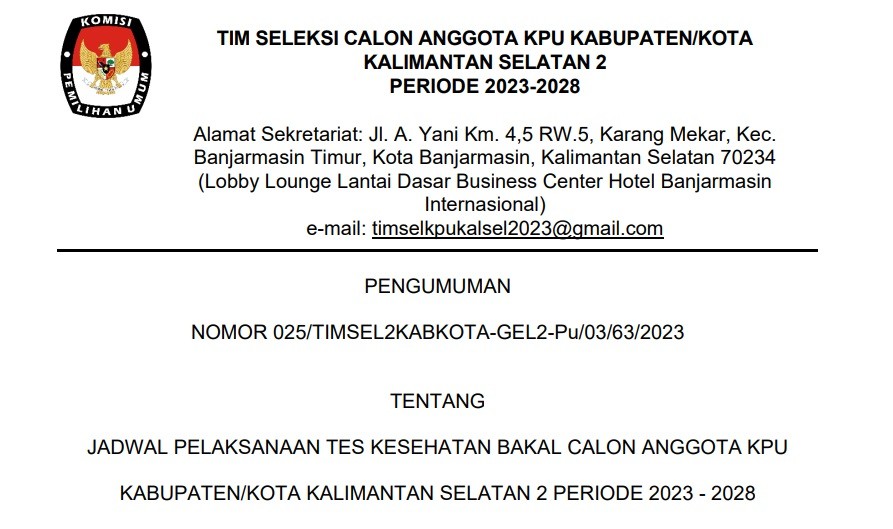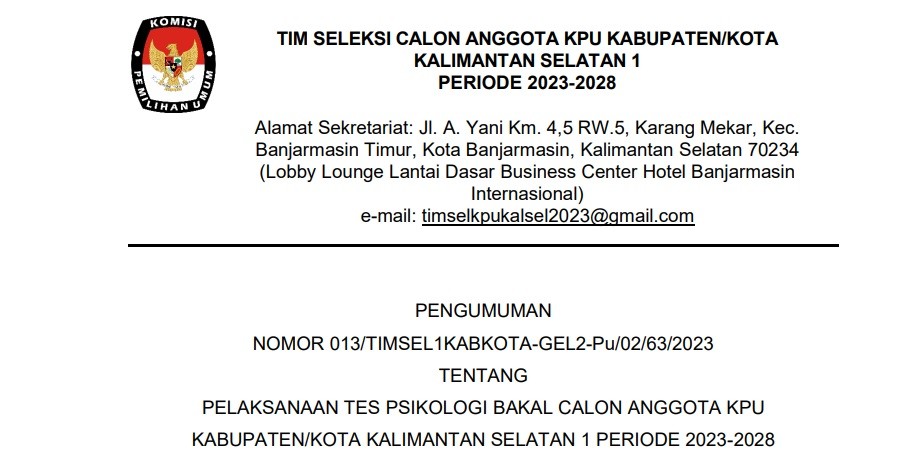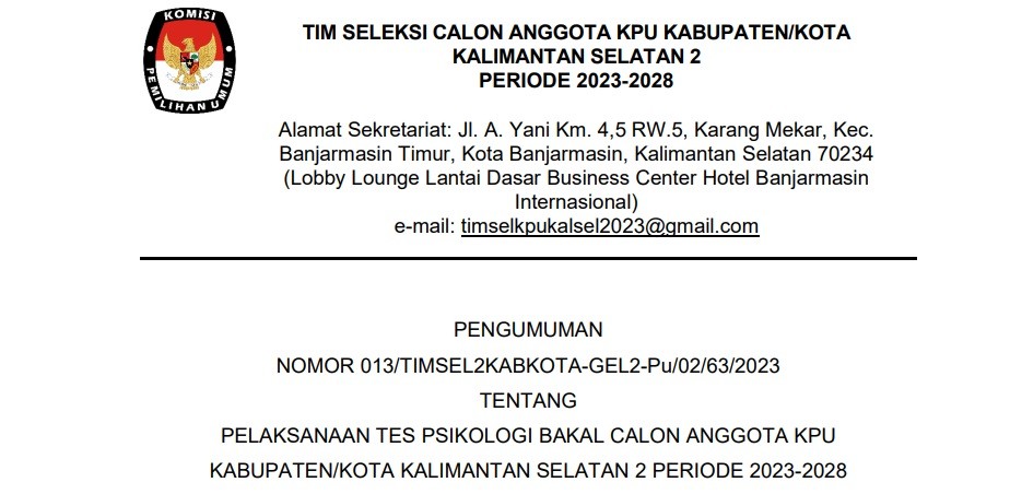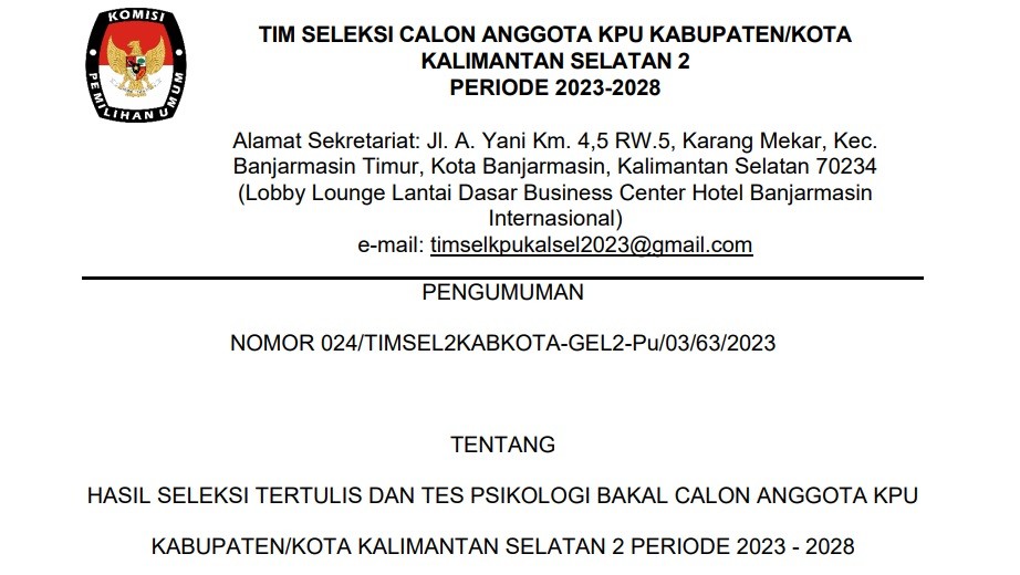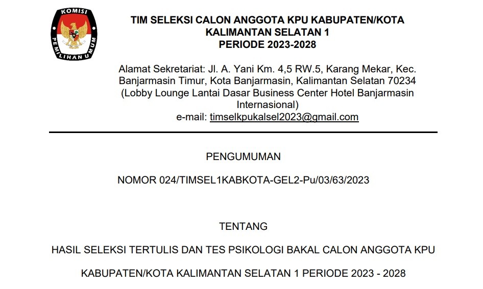 Berdasarkan Berita Acara Tim Seleksi Nomor 22/TIMSEL2KABKOTA-GEL2-BA/03/63/2023 tanggal 07 April 2023 tentang Penetapan Hasil Seleksi Tertulis dan Tes Psikologi Bakal Calon Anggota KPU Kabupaten/Kota Kalimantan Selatan 2 Periode 2023 - 2028, Bakal Calon yang lulus Seleksi Tertulis dan Tes Psikologi serta berhak mengikuti Tahapan Seleksi berikutnya yaitu sebagai berikut: [KLIK DISINI]