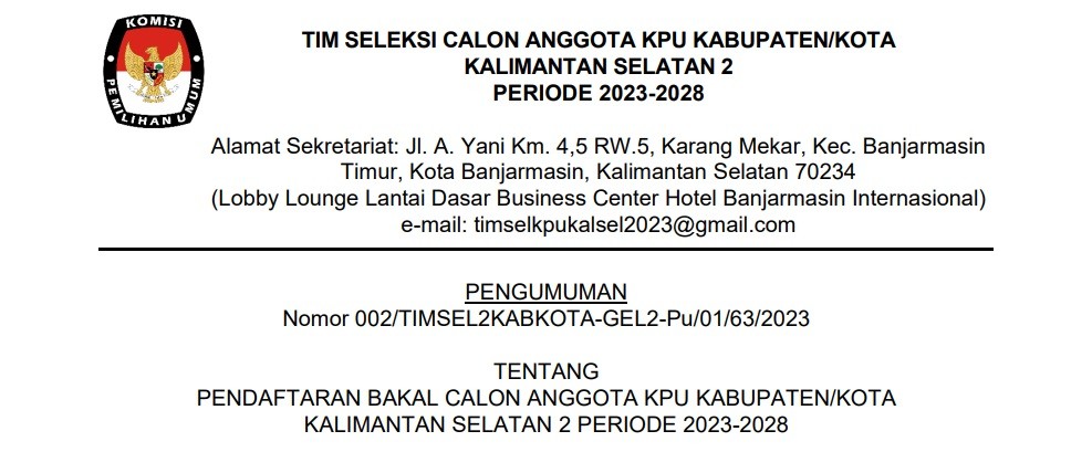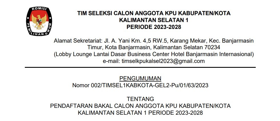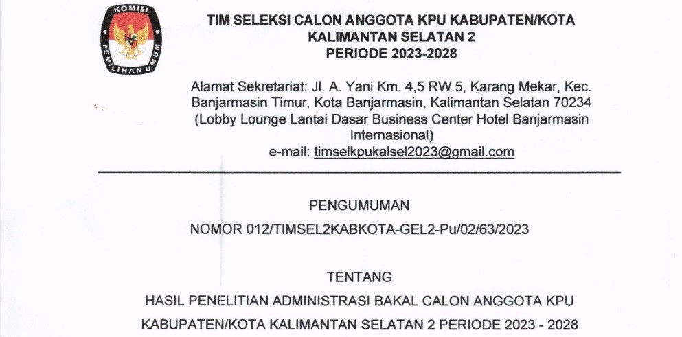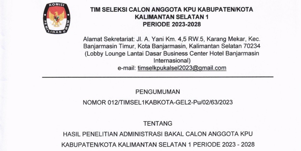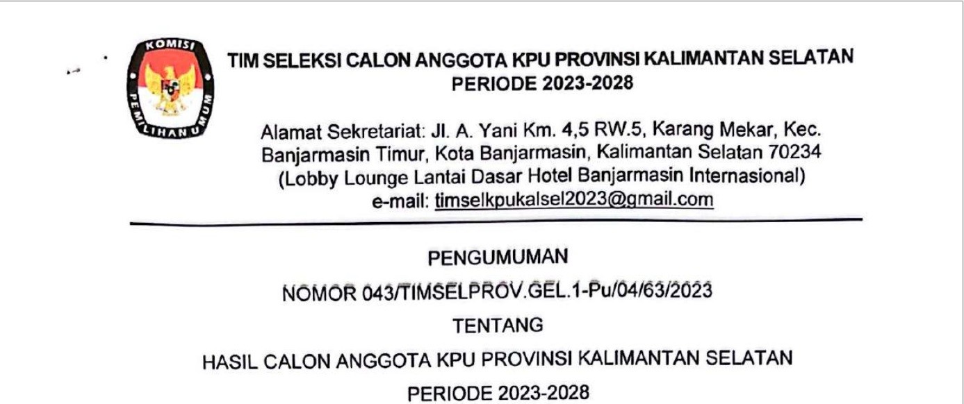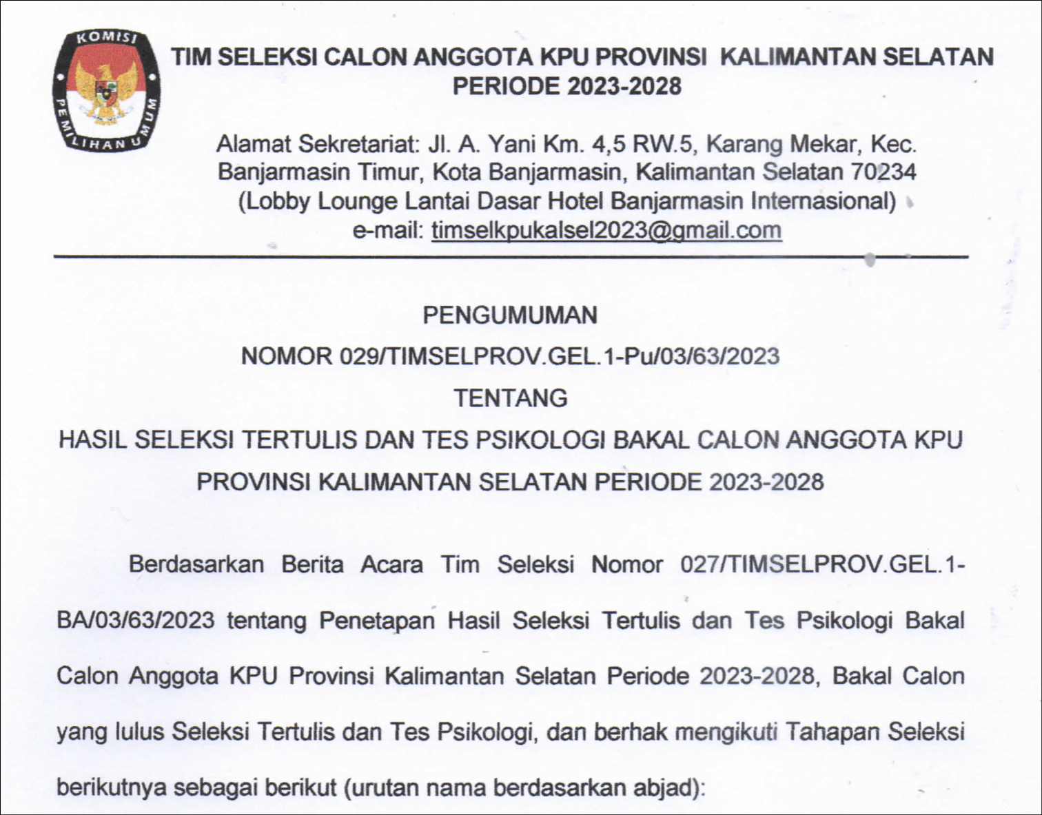 Hai #TemanPemilih, Berdasarkan Berita Acara Tim Seleksi Nomor 027/TIMSELPROV.GEL.1-BA/03/63/2023 tentang Penetapan Hasil Seleksi Tertulis dan Tes Psikologi Bakal Calon Anggota KPU Provinsi Kalimantan Selatan Periode 2023-2028, Bakal Calon yang lulus Seleksi Tertulis dan Tes Psikologi, dan berhak mengikuti Tahapan Seleksi selanjutnya yaitu nama-nama yang tercantum melalui PENGUMUMAN HASIL SELEKSI TERTULIS DAN TES PSIKOLOGI BAKAL CALON ANGGOTA KPU PROVINSI KALIMANTAN SELATAN PERIODE 2023-2028 yang dapat diakses melalui link berikut: >>KLICK DISINI<<