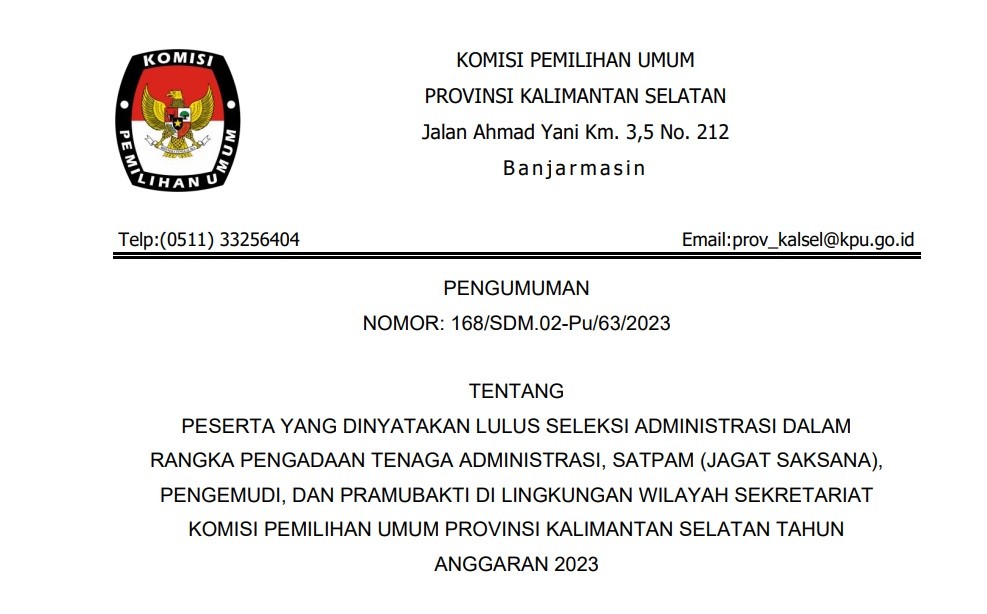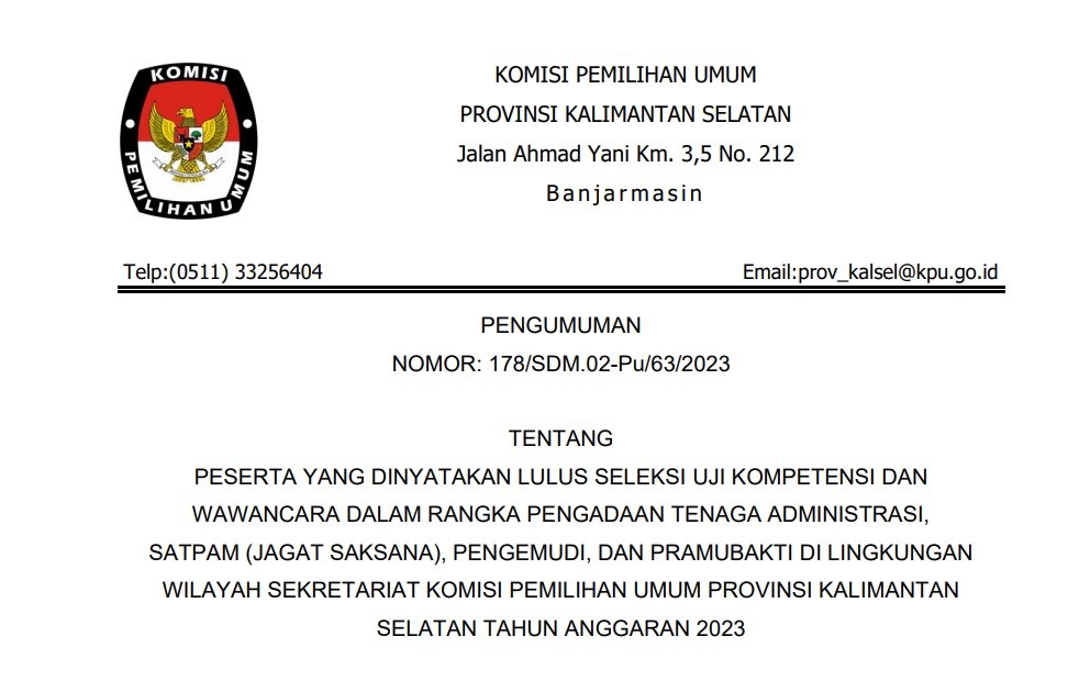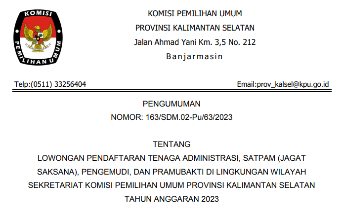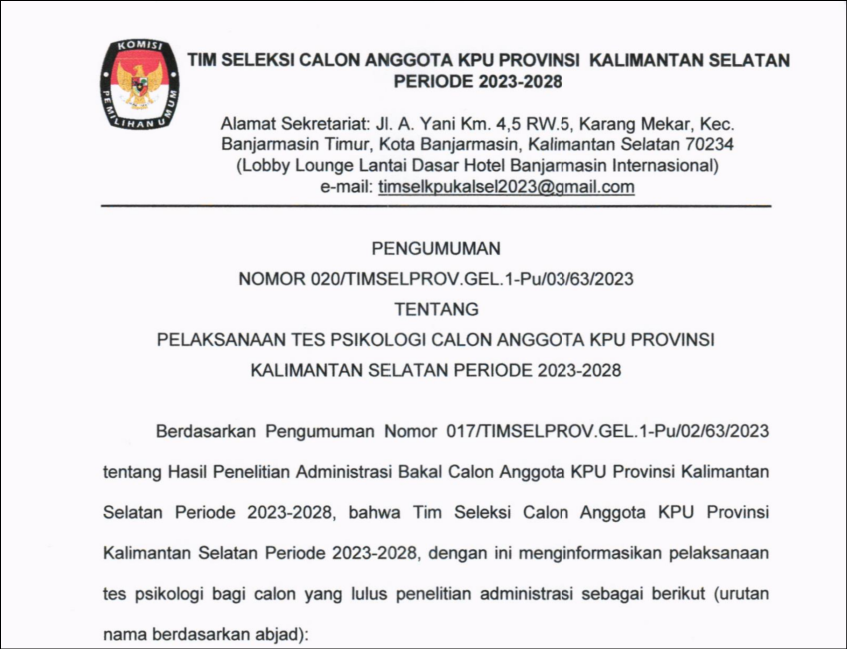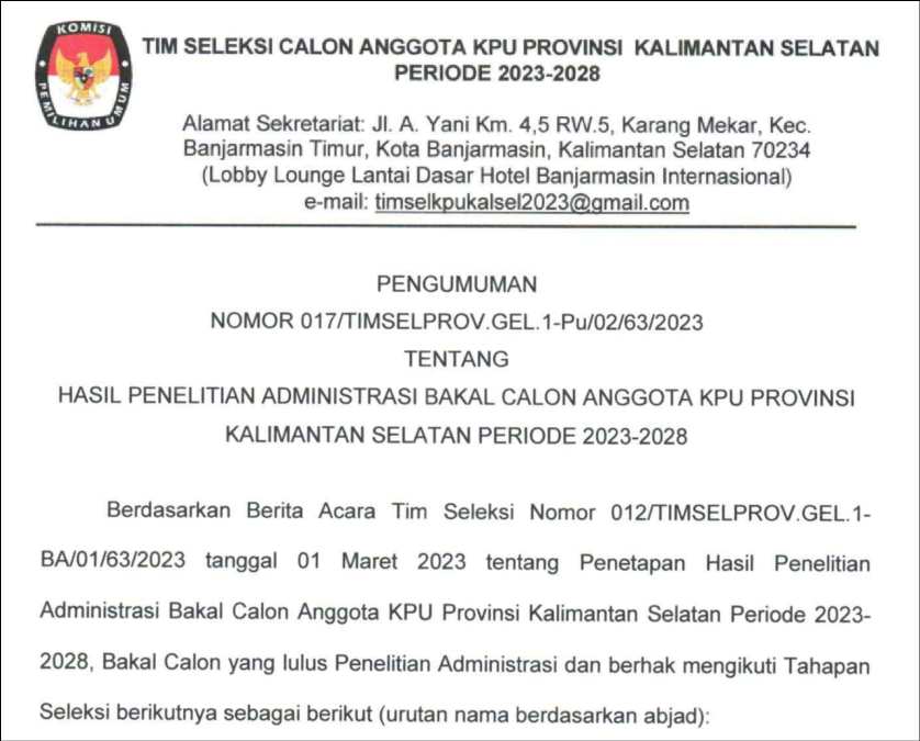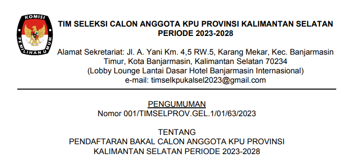 Berdasarkan Keputusan KPU Nomor 71 Tahun 2023 tentang Jadwal Tahapan Pelaksanaan Seleksi Calon Anggota Komisi Pemilihan Umum Provinsi di Provinsi Bengkulu, Jambi, Sumatera Barat, Kepulauan Riau, Kepulauan Bangka Belitung, Banten, Daerah Khusus Ibukota Jakarta, Kalimantan Barat, Kalimantan Selatan, Kalimantan Tengah, Sulawesi Utara, Sulawesi Tengah, Sulawesi Barat, Sulawesi Tenggara, Sulawesi Selatan, Gorantalo, Papua Tengah, Papua Selatan, Papua Penggunungan, dan Papua Barat Daya Periode 2023- 2028, dengan ini Tim Seleksi Calon Anggota KPU Provinsi Kalimantan Selatan Periode 2023-2028 mengundang Warga Negara Indonesia yang memenuhi persyaratan untuk mendaftarkan diri menjadi Calon Anggota KPU Provinsi Kalimantan Selatan Periode 2023-2028, dengan ketentuan sebagai berikut: KLIK DISINI