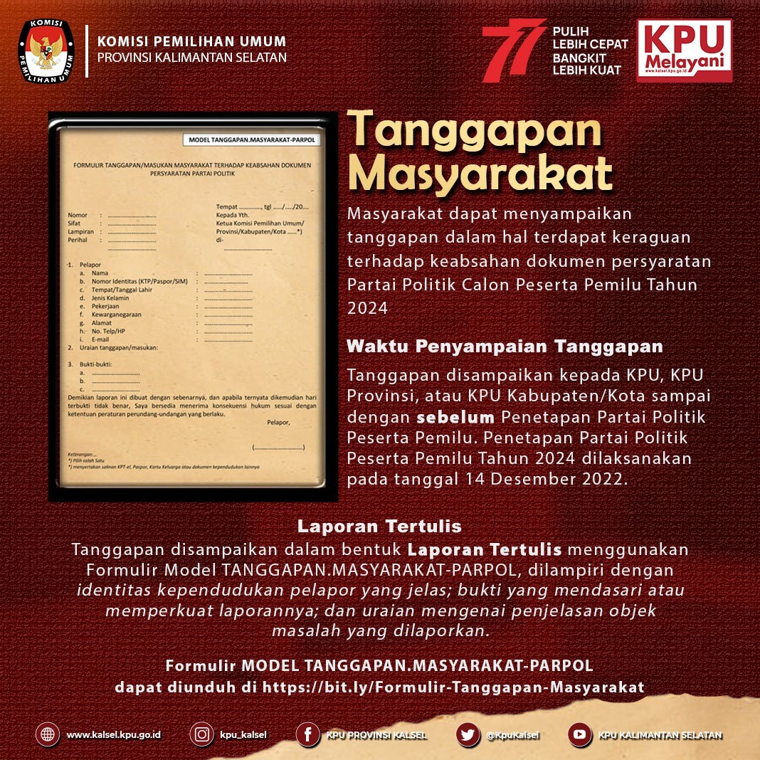 Masyarakat dapat menyampaikan tanggapan dalam hal terdapat keraguan terhadap keabsahan dokumen persyaratan Partai Politik.